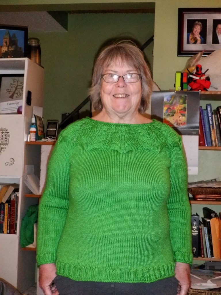 The “Latte Swirl” sweater has been finished and sent and received! I’m super proud of how it turned out and I’m really proud of my ability to adjust the pattern to give my mom a perfect fit. She got it the day after Mother’s Day and sent me a picture right away. The elastic bind-off was great for this item too.