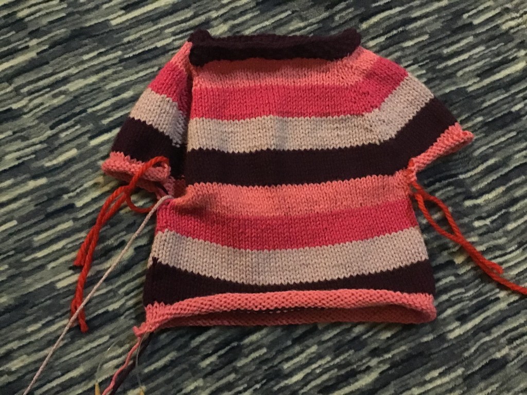 I’ve started my middle daughter’s sweater. Definitely not done by her birthday (today), but so far it fits, and she knows it’s coming. I’m not sure how I feel about the stripes, but then again, I’m not much for stripes. I also did a few of the things I know better than to do. I put the yarn balls and pull-skeins in a bag with holes in the top for the yarn. This meant tangling that was not so easy to twist out. I wound up cutting one color, running to the end of the ball with another color, and one didn’t fit in the bag in the first place, so all is untangled now.