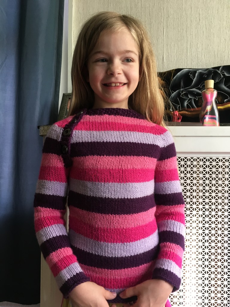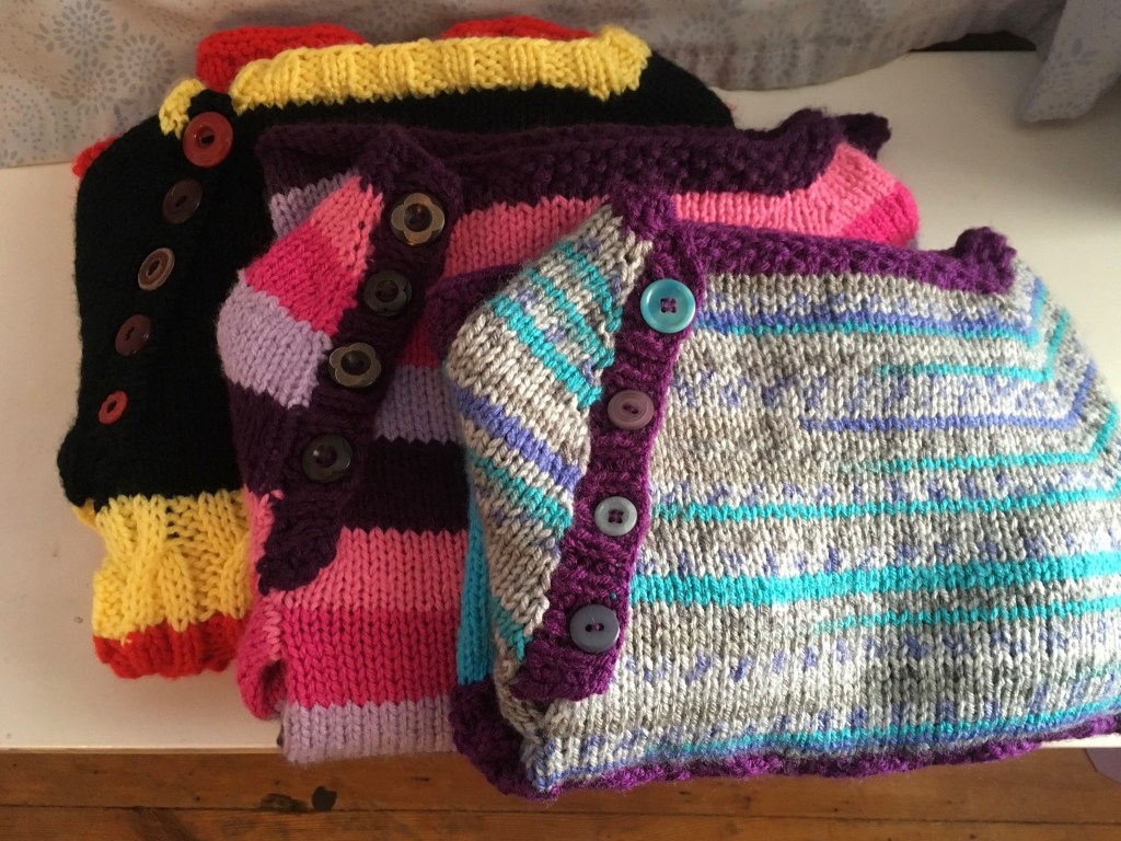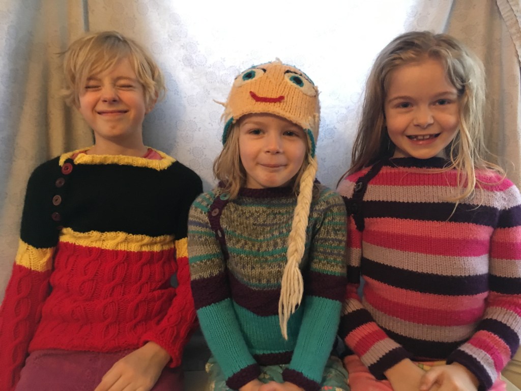 I am very excited to say I finished the sweaters! All three of my girls have a similar sweater made to their style and with their favorite colors. Just in time for me to head back to work.