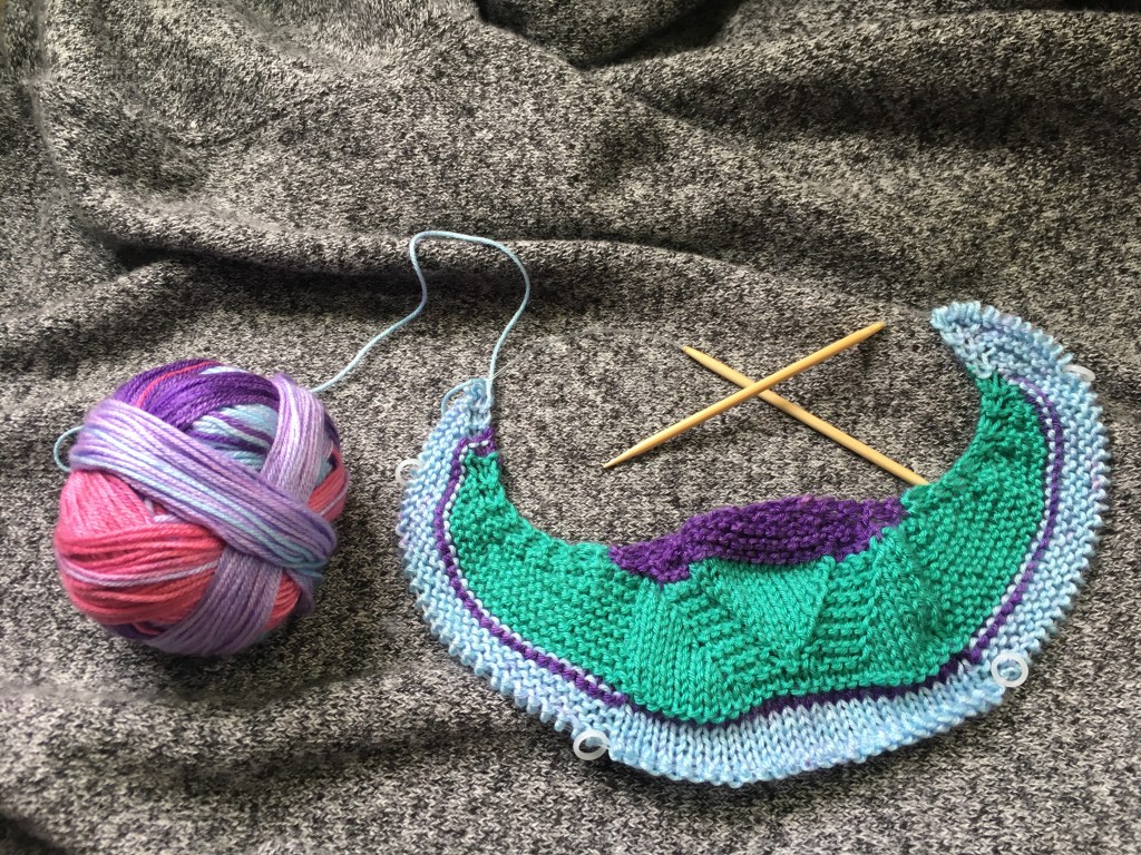 Now I’ve started a shawl for a friend. I love the beginning of a shawl. It starts to work up so quickly. Then the rows get longer and longer, and longer… The color changes I added to this one has been helping, but I don’t think the cable on the needles I’m using is long enough. Oh well, it’ll work.