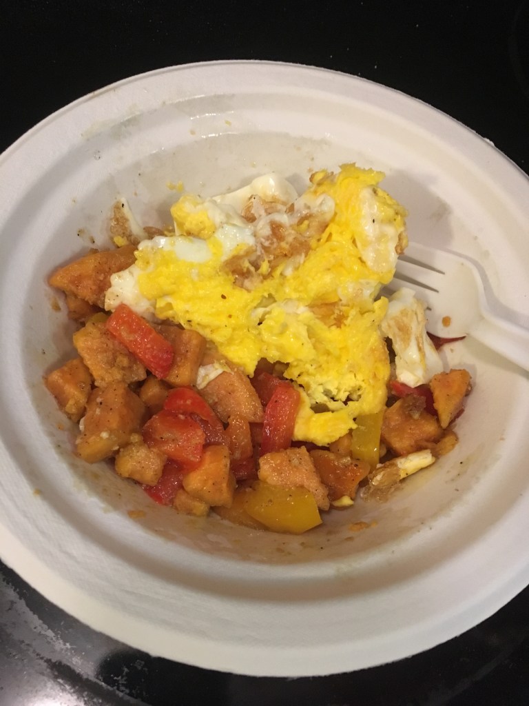 One of my favorite breakfasts! I have to admit though, I don’t usually eat until brunch-time. It takes a few cups of coffee for me to be awake enough. And then I make myself something like this! It’s left-over sweet potato hash with peppers and an egg scrambled in. Super easy! It keeps me going for a long time.