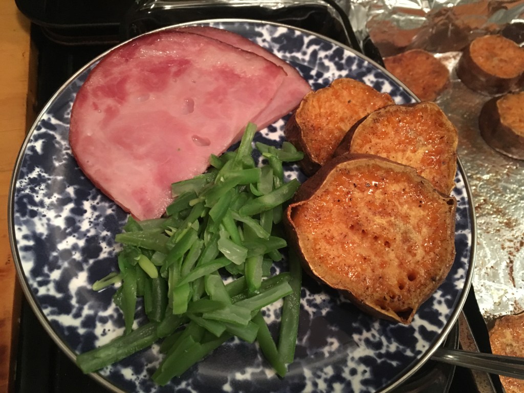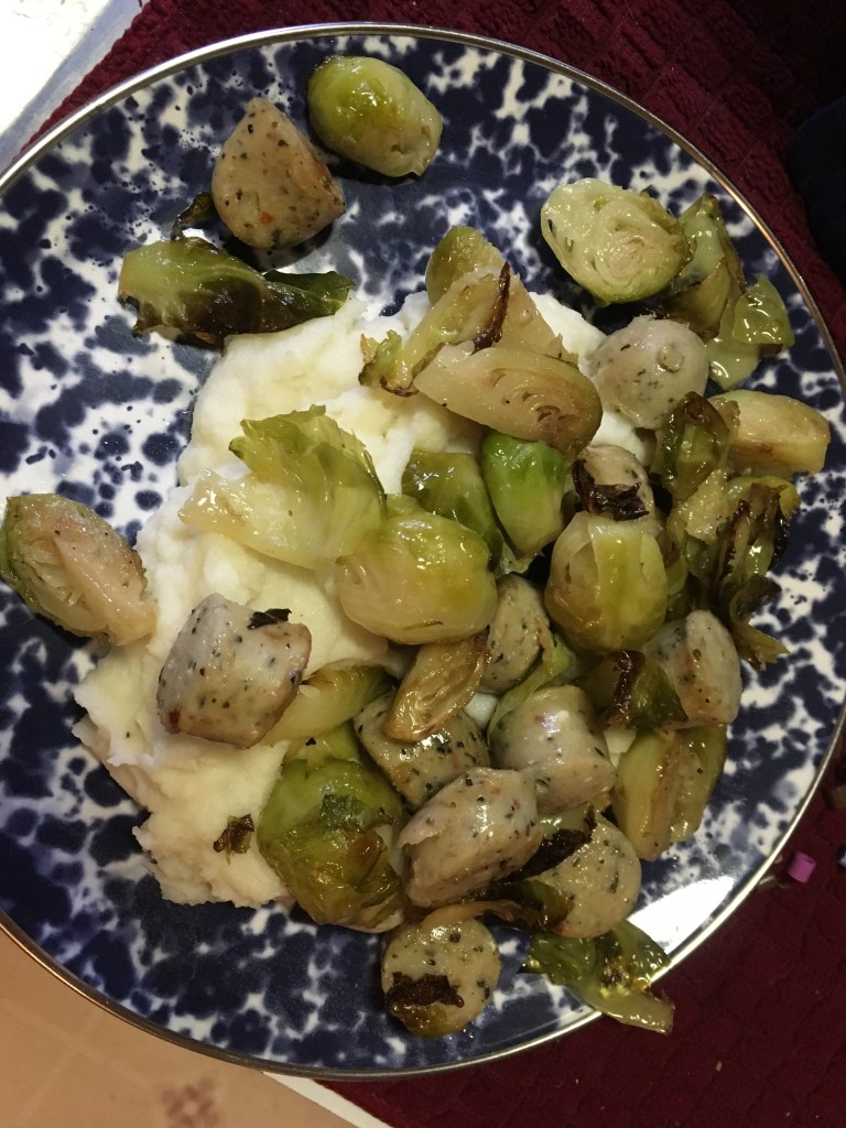 More roasted dinners! I absolutely love working in the kitchen, putting it all together, getting it in the oven, and walking away. The first one is leftover potato and sausage casserole. Since my girls ate all the Brussels sprouts, I added broccoli for some vegetable. Another night, I put some ham in the oven with sliced sweet potatoes and heated up some frozen green beans in the stove. I always add honey and brown sugar to any ham I bake. Last is yet another chicken sausage and Brussels sprout casserole. I made some mashed potatoes on the stovetop. Again, the girls loved the sprouts.