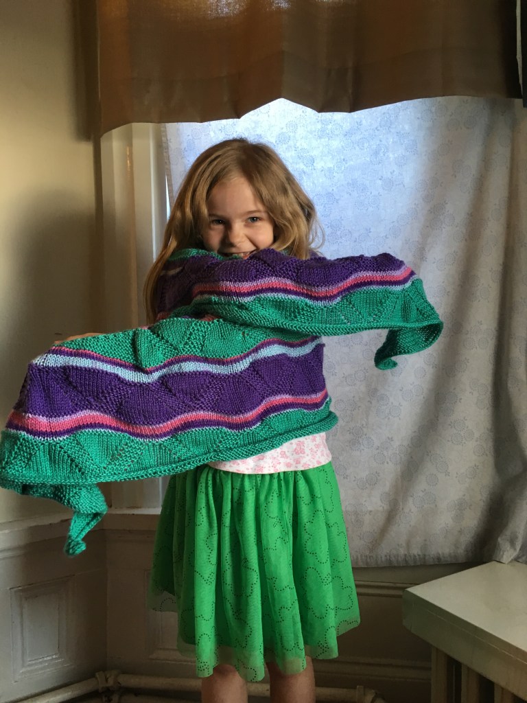 Just as I predicted. The wrap was not meant for me, but for my bright and moody middle child. She had her eye on it for a while and made sure I knew it. I am happy she enjoys it. It was fun to knit up and I’m bursting with shawl and wrap ideas from the experience. Besides, she always loves a good photo shoot.
