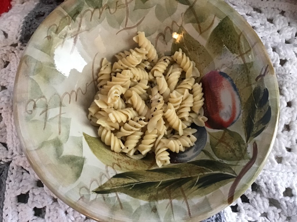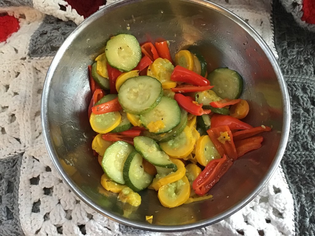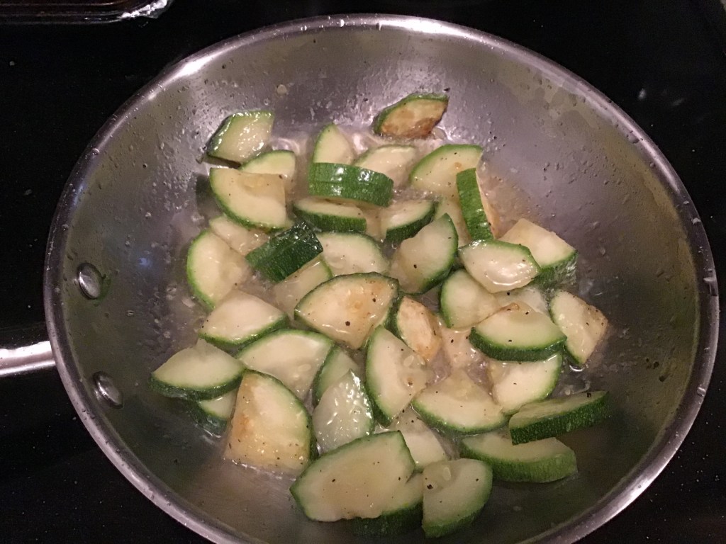 This as my first attempt at ratatouille. My eggplant did not survive my cooking and I had to leave it out. I have only ever cooked it once before. I cooked the pasta in salty basil water and the zucchini was sautéed in oil with garlic and a bit of salt. Since I am not a big fan of cooked tomatoes, those and the red peppers were lightly heated in oil and a bit of salt and basil. Then I mixed all the veggies together and put them over the pasta and some of that rotisserie chicken we had left. It was delicious. I’m excited for my next attempt.