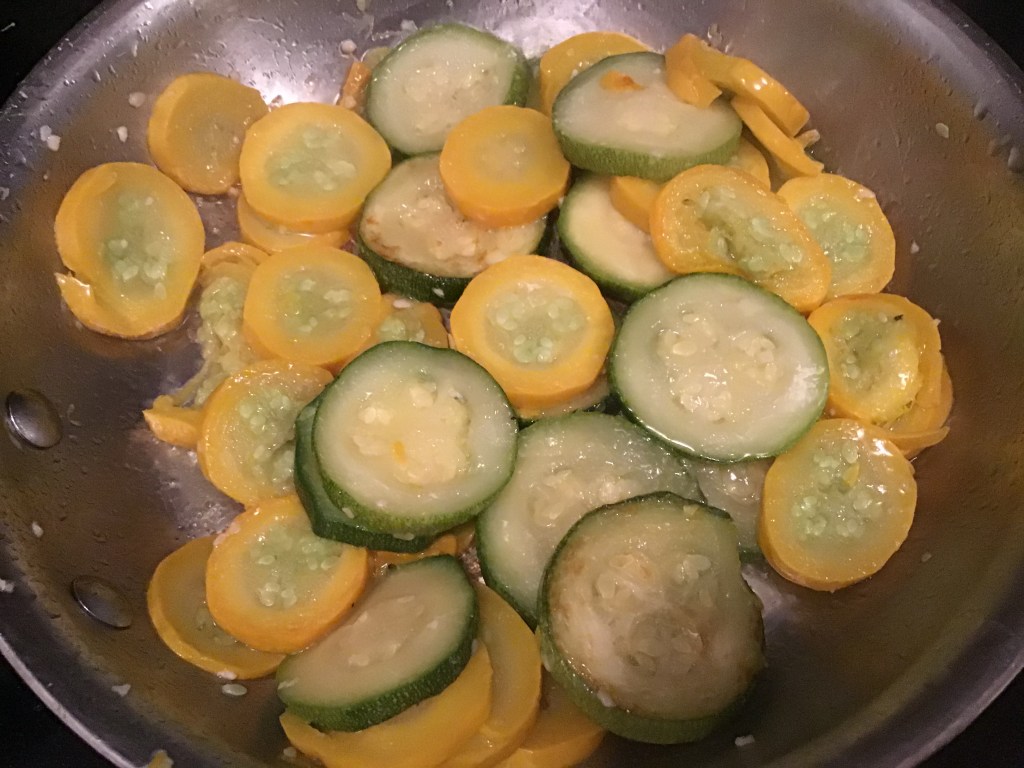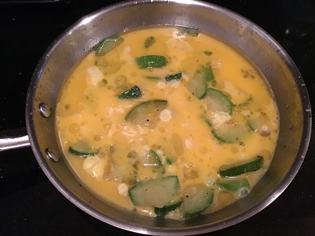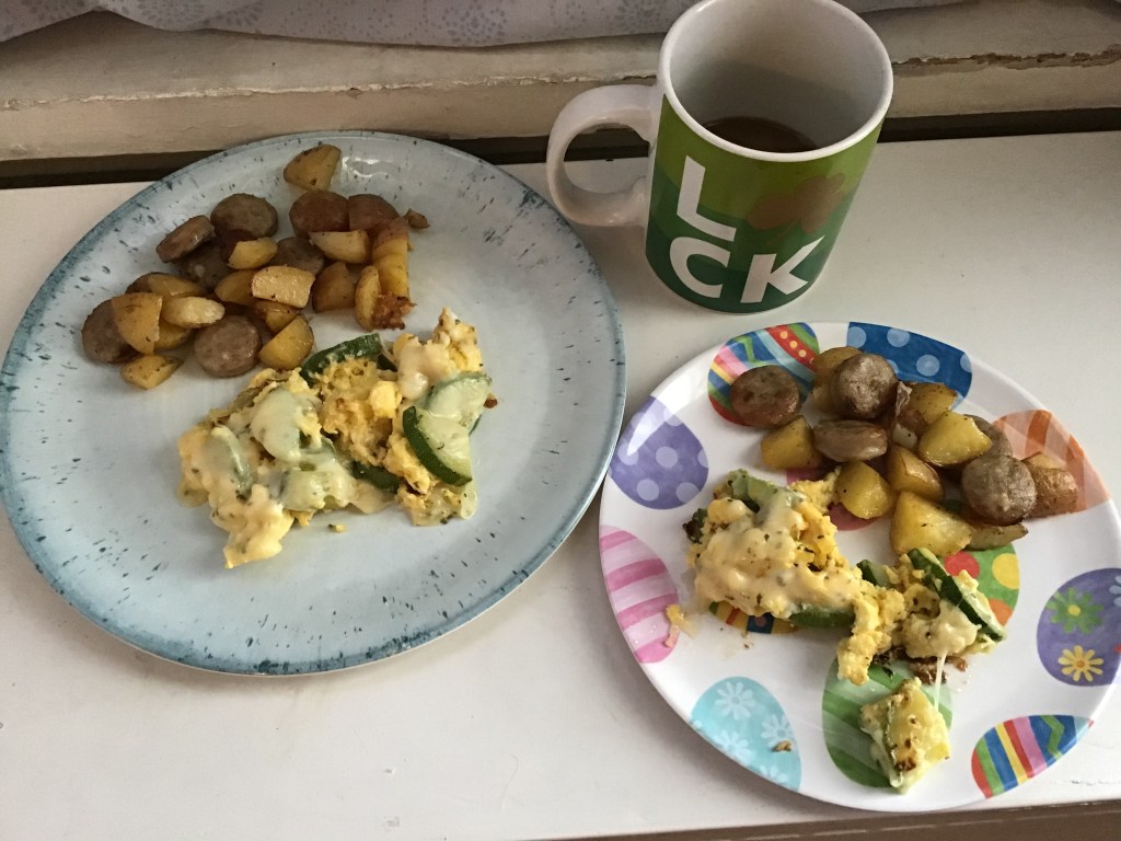 Breakfast the next day. I used the rest of the potatoes and some sausage roasted in the oven. Then I sautéed some zucchini until it was soft and added eggs. I melted provolone cheese on most of the eggs. Yummy!