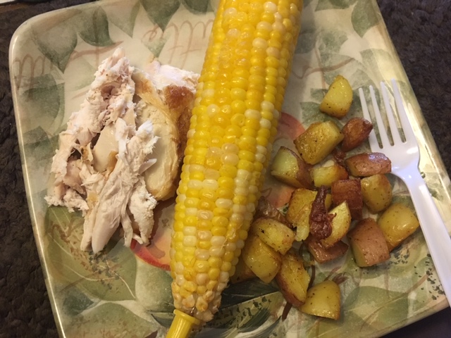 Store bought rotisserie, boiled corn on the cob, and pan roasted potatoes. The girls were so excited for corn on the cob! I used my usual mix of spices, plus a bit of ginger on the potatoes.