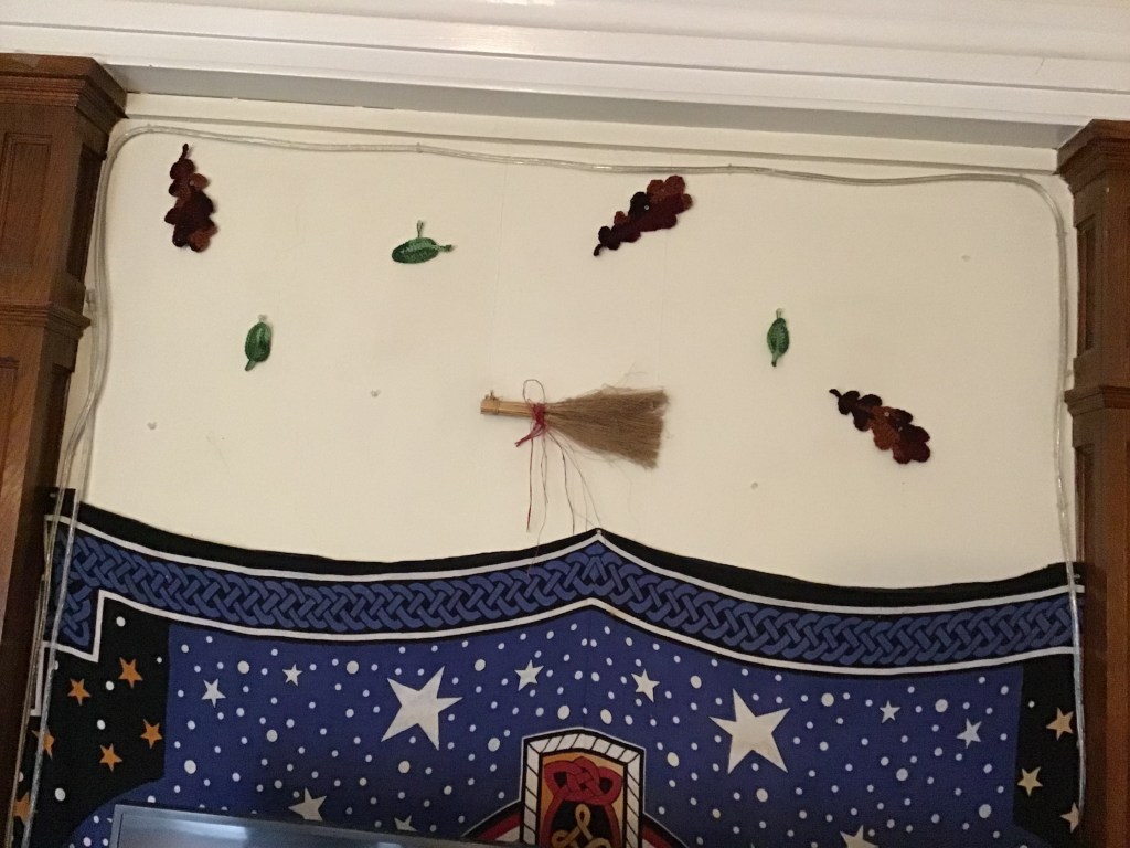 So here is the start of this year’s side project. I’m pretty pleased so far. I’m going to be making a few more of the green leaves and maybe some maple leaves. On each side of the posts I hang this stuff as well, so I’m going to make apples and acorns for that. Maybe put the maple leaves on the sides. I’ve got some ideas for Halloween ones too. Maybe if I have a set for each phase of Autumn (early, Halloween, and Thanksgiving), I won’t keep misplacing stuff every year.