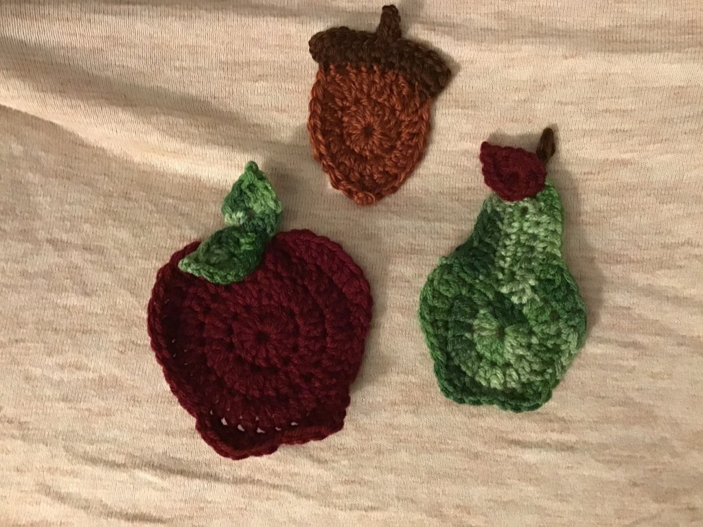 The apple is another free one online. Just search for ‘crochet apple coaster’. The acorn and the pear I made up myself. The pear kept me up for hours. I refused to quit until I got it right and it took several tries. These hang on either side of the leaves, so I have two of each.
