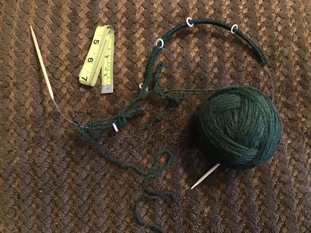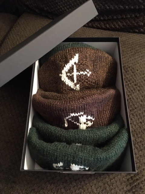 I began to design a female archer much like the figures and images in the studio. She took a lot of revisions and several attempts at knitting. I have kept the first two hats. After that, I had it figured out. Then I mapped out a large bow and arrow. That was pretty straightforward and only took me a little reworking to get it right. There were no trial hats for this pattern.