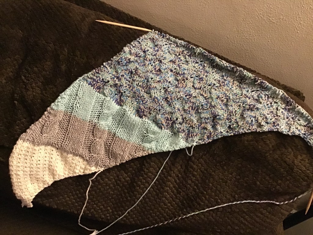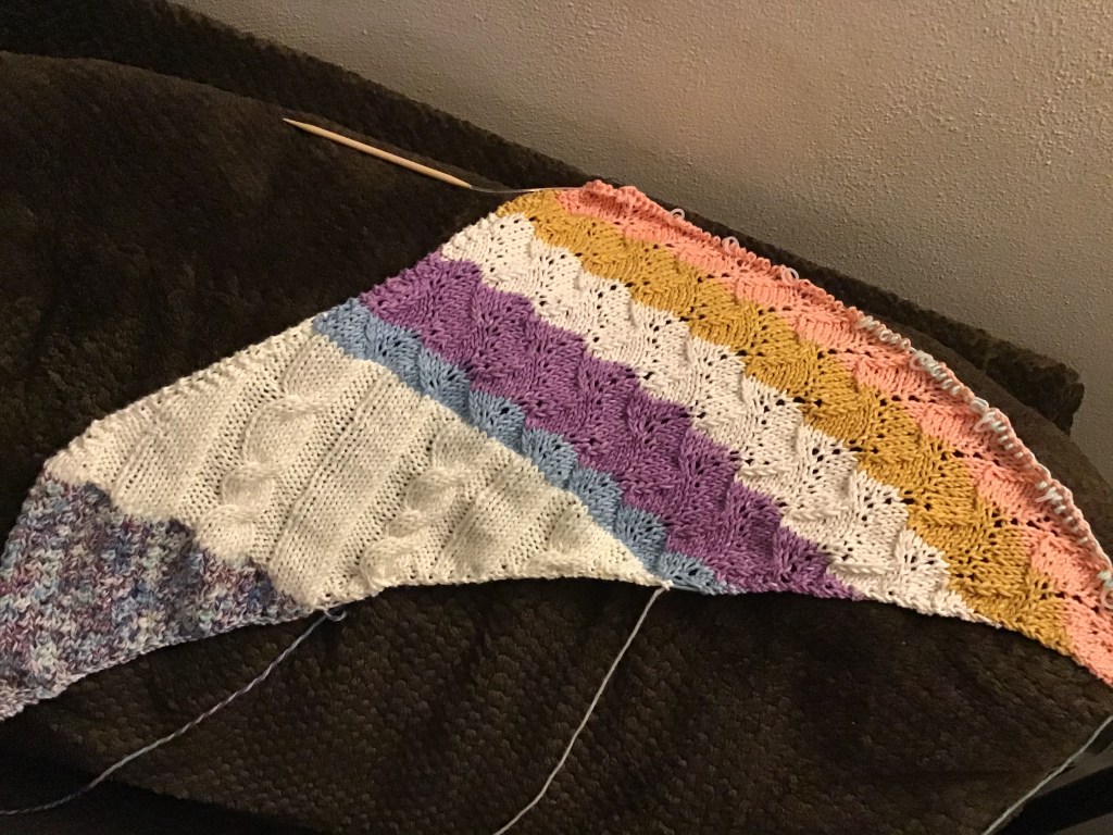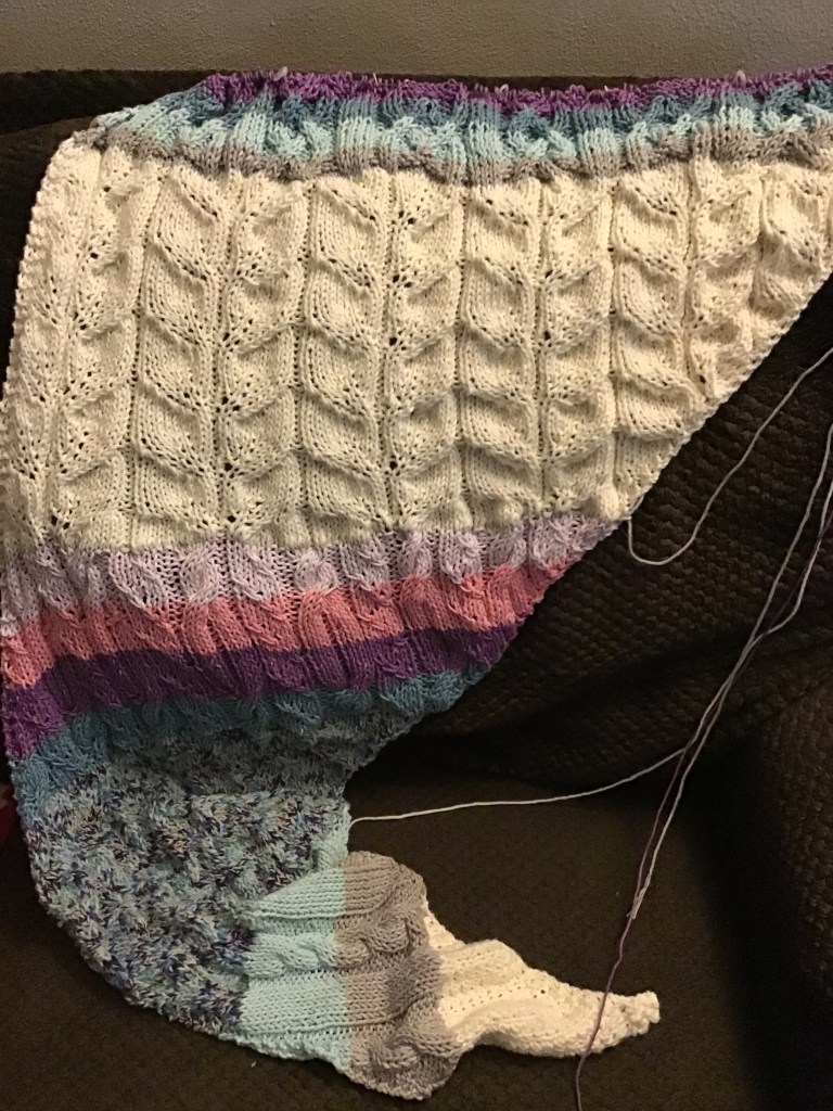 I had developed a color pattern and a design pattern. I started with an all-over pattern and then a cable pattern and have continued in this way for the shawls. For this latest section I pulled out my Viking pattern book (to give a nod to our Celtic/Viking heritage) and began to flip through looking for the perfect cables for the cable section. It took me a while to land on the two I wanted to use, but I was excited to begin. I had to learn a couple new stitches and remained firm on not looking until I had gotten through enough repeats to really see the pattern. It is beautiful. I’m proud of the results and am looking forward to working on them for both shawls.