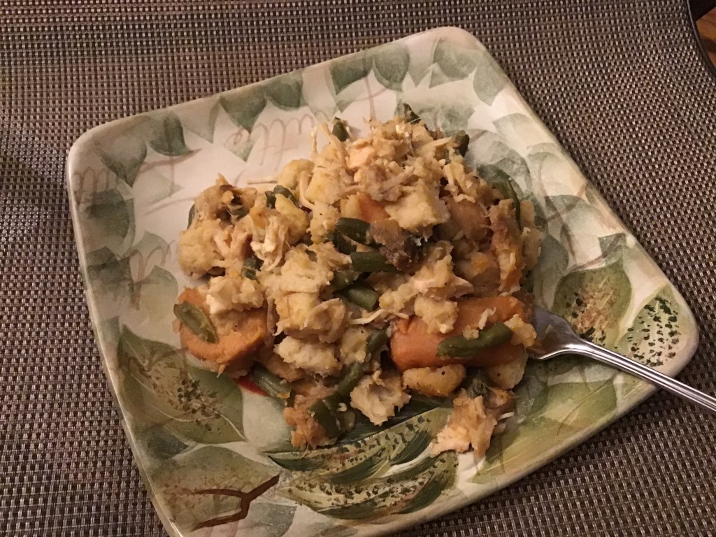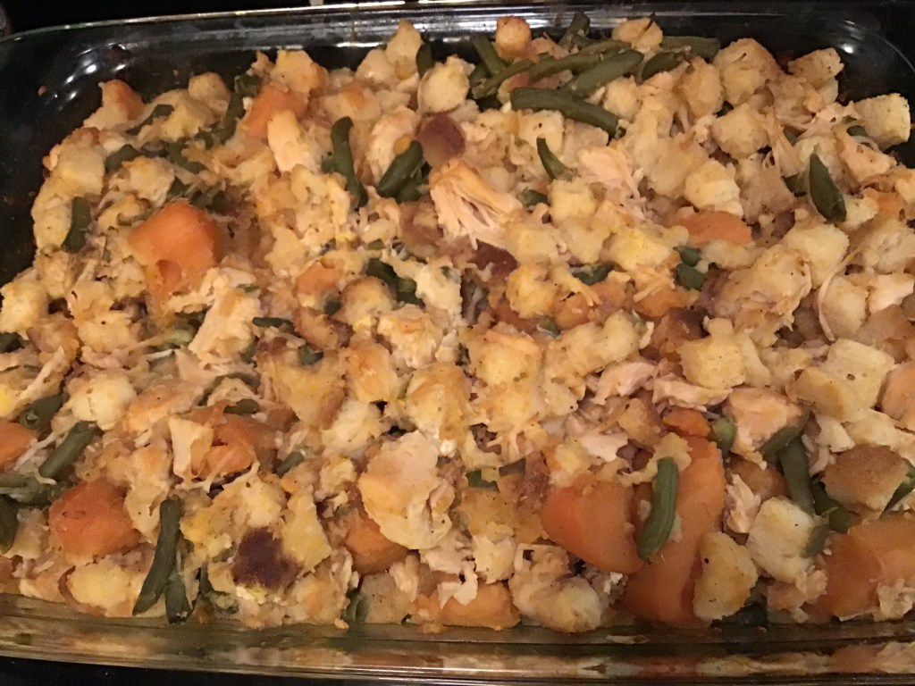 This casserole was me scrapping the bottom of the barrel in our pantry. A bag of bread crumbs for stuffing. Canned green beans, chicken, and yams. And a whole lot of chicken broth. I just kept mixing and adding broth every 10-20 minutes for about an hour. Something to think about for Thanksgiving leftovers, which is exactly what my daughter said it tasted like. I honestly had no idea if it was going to be any good and was delighted to find it quite a delicious surprise.