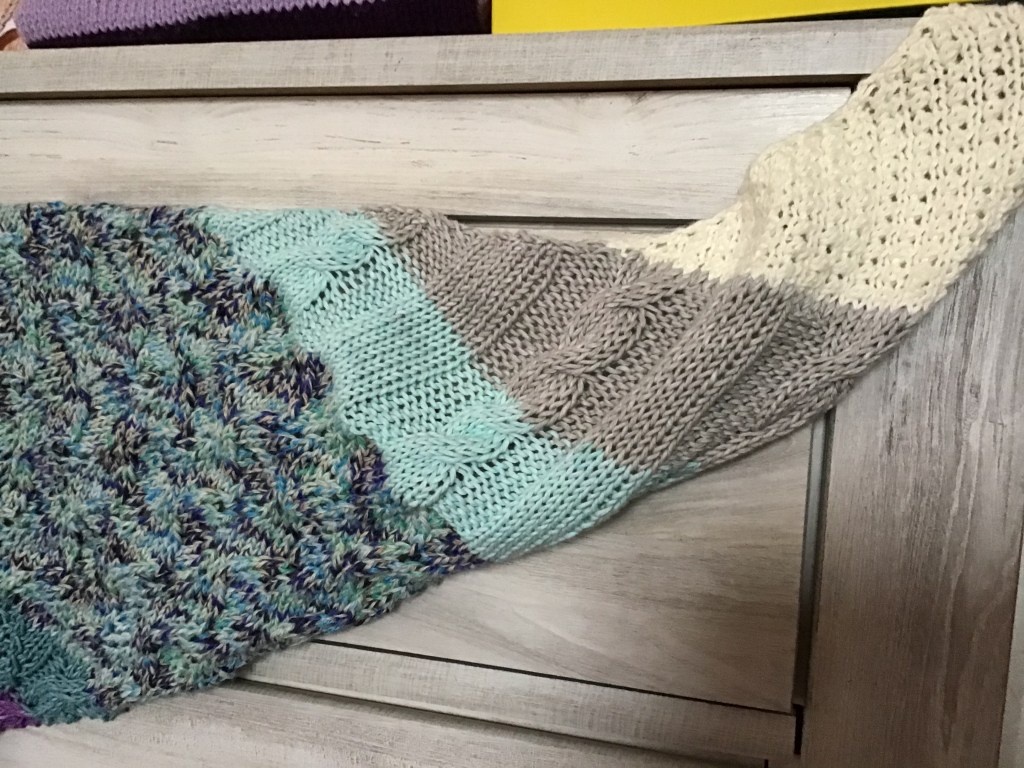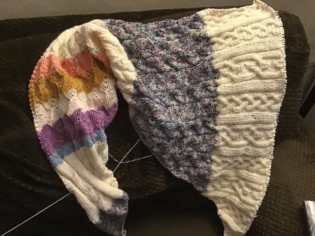 A few more rows in the cable section to go, and then it’s on to the lacy stars for the finish. Part of the Sister Shawl story is also the colors I chose. We both have white, her marble color is more of a blue while mine is more of a purple, and the self-striping yarn has a few different shades for each. I also did not repeat the colors in the same order. We come from the same family and have been given a lot of the same clothes, opportunities, friends, and such over the years – especially since we are so close in age – but we always put our own spin on everything and we are pretty different people. It’s been a crazy and trying journey, but I have the most amazing sister and am so happy that age has brought us closer together.