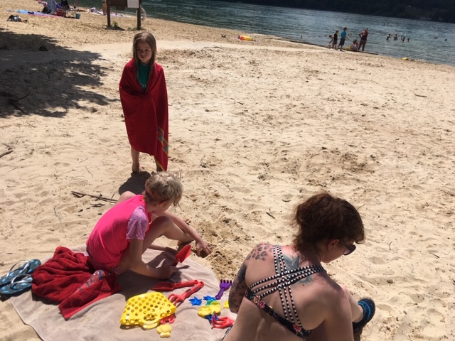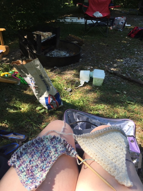 The beginning of the shawl. I started them at the campsite. There is almost nothing better than sitting in the sun knitting. A pebble pattern for the gravel road we came in on and camped alongside. It definitely stirs up some sensory memories for me. I hope it does for her too. I did some basic rope cables next to represent the ropes we used for the tent I slept in every night with at least one kid. And the ropes used for the rain tarp my step-dad put up (we helped, but it is his creation-he’s an engineer).
