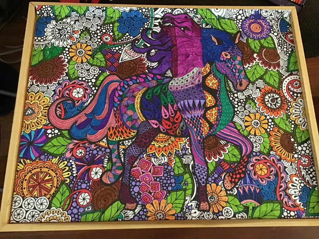 The biggest news is that we have begun completing this puzzle as a family. My stepdad made us puzzle boards and they have been going mostly unused. I spent three days putting it together with a little help. Now everyone is helping to color it. It is set up in our living room, which is ever closer to being all moved in looking and has been a great way to relax at the end of the day. I’m happy that we have reached the puzzle stage of family dynamics. We even have a set of markers just for the puzzle.