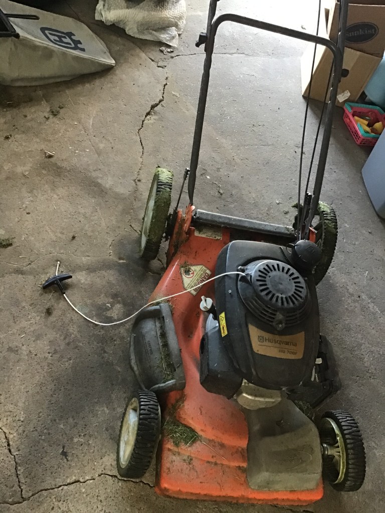 Another time, the cord snapped in half as I pulled to start it. One time, I was just too tired from mowing to pull the cord right. And today. Today, the fixed cord decided to pop out of the pull handle. The grass is too long, I’ve been too tired or it’s been too hot (over 90 degrees Fahrenheit plus humidity), and I really just want this damn lawn mowed.