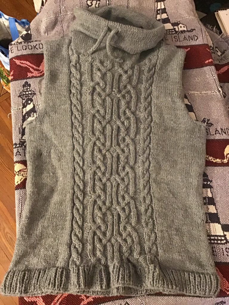 Both have entered sleeve land and mine still has some rib edging to do yet. It has been very satisfying to work on something for both of us during this really tough time. I don’t even care about my mis-crossed cables on the back of my sweater. Or the too-short I-cord on his. They speak to the imperfection of our lives together and those imperfections make us who we are.