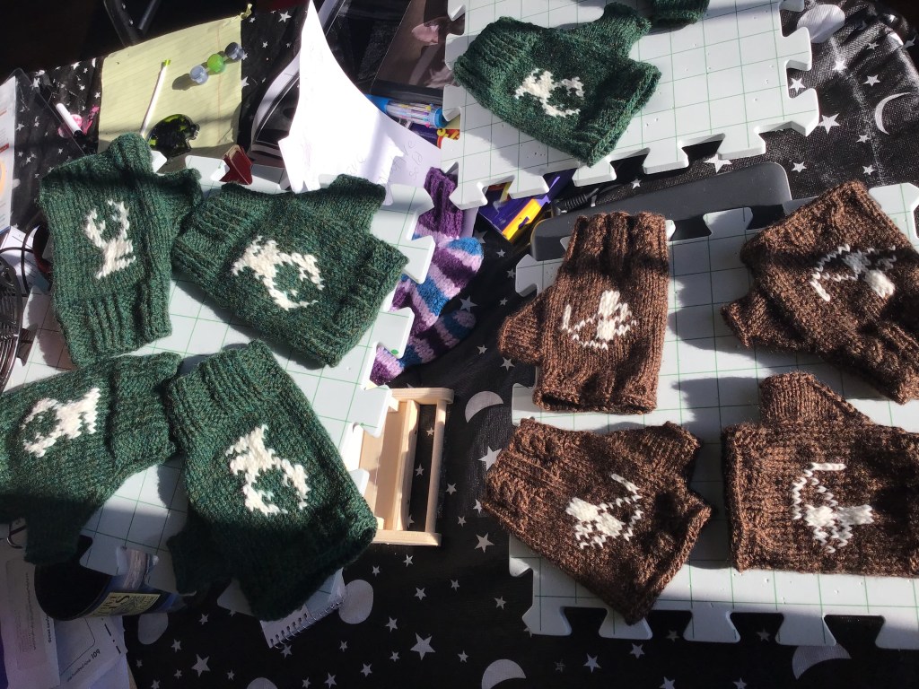 Every chance I get I’ve been clicking away with my needles to get a lot of these mitts done. They are my latest design for my Artemis line, only sold at Artemis Massage Studio where I work. They are being added to all the hats I’m still making as well.