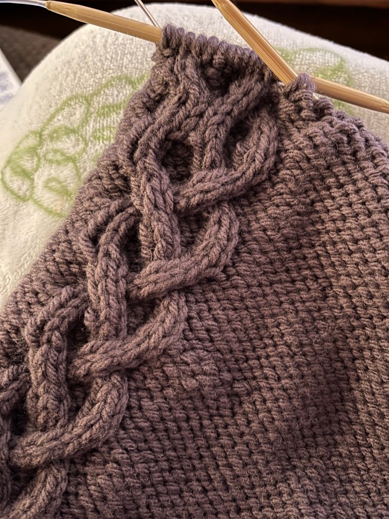 But we’ve had to rip out a lot of the progress we’ve made. Many months I have searched with no plum yarn to be found. So I am adapting with a soft compliment. Deep breath. Pull the thread.