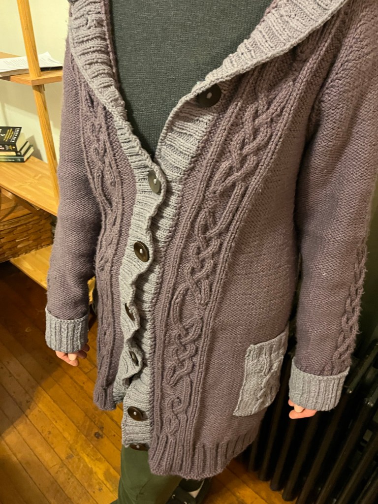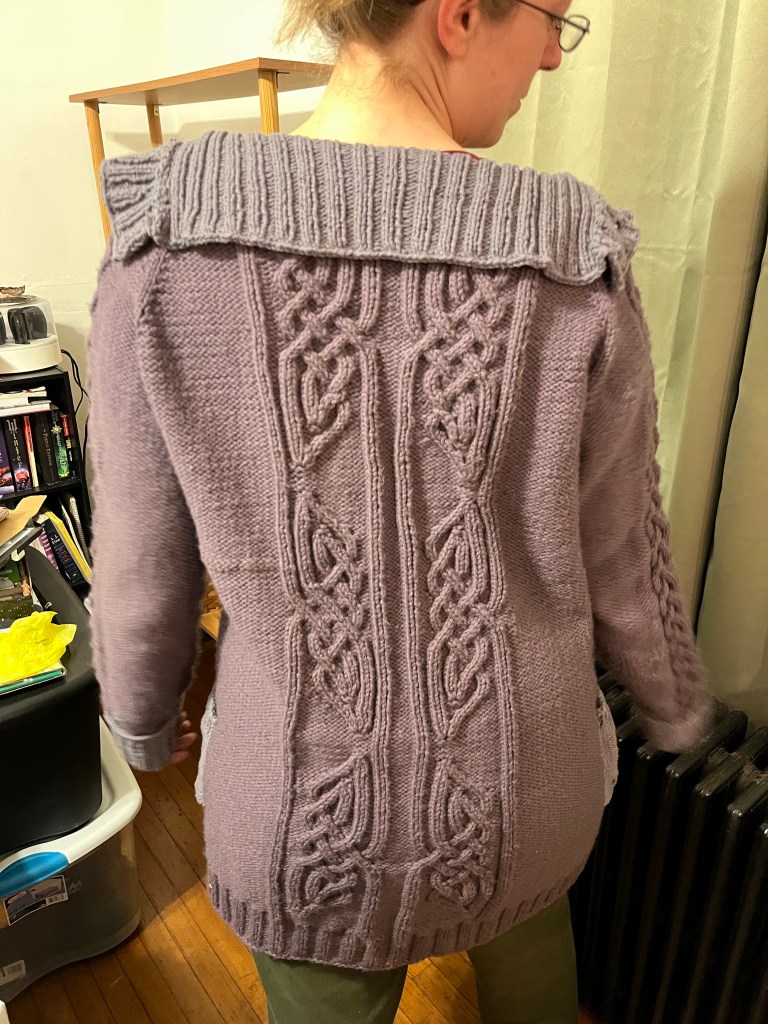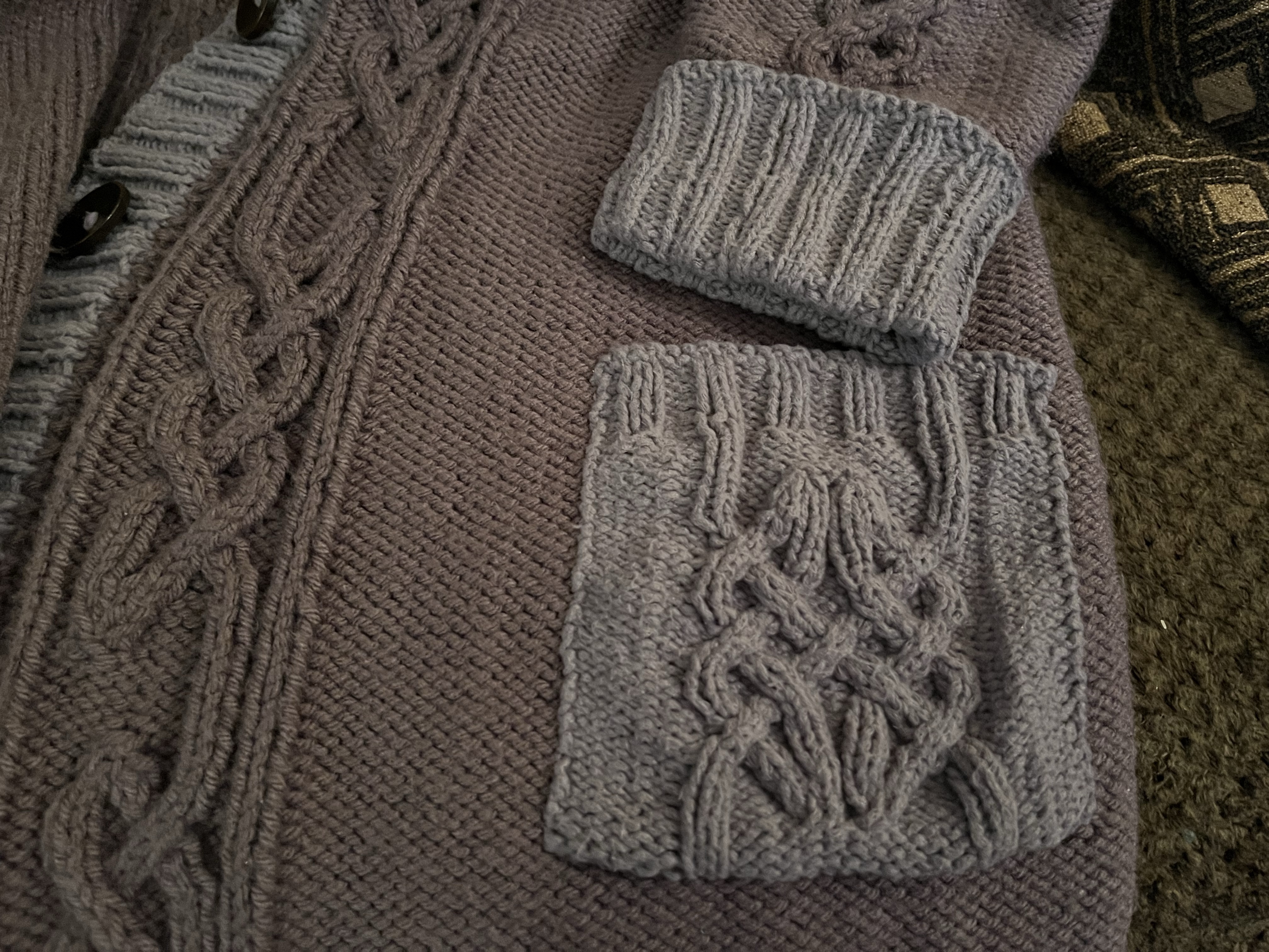 I forgot why I made it so long. I like long jackets, but I would have made it an inch or two shorter. I remembered that I had to add a different knot to the front to keep it even with the back. Then I remembered the cables on the back determined the length!