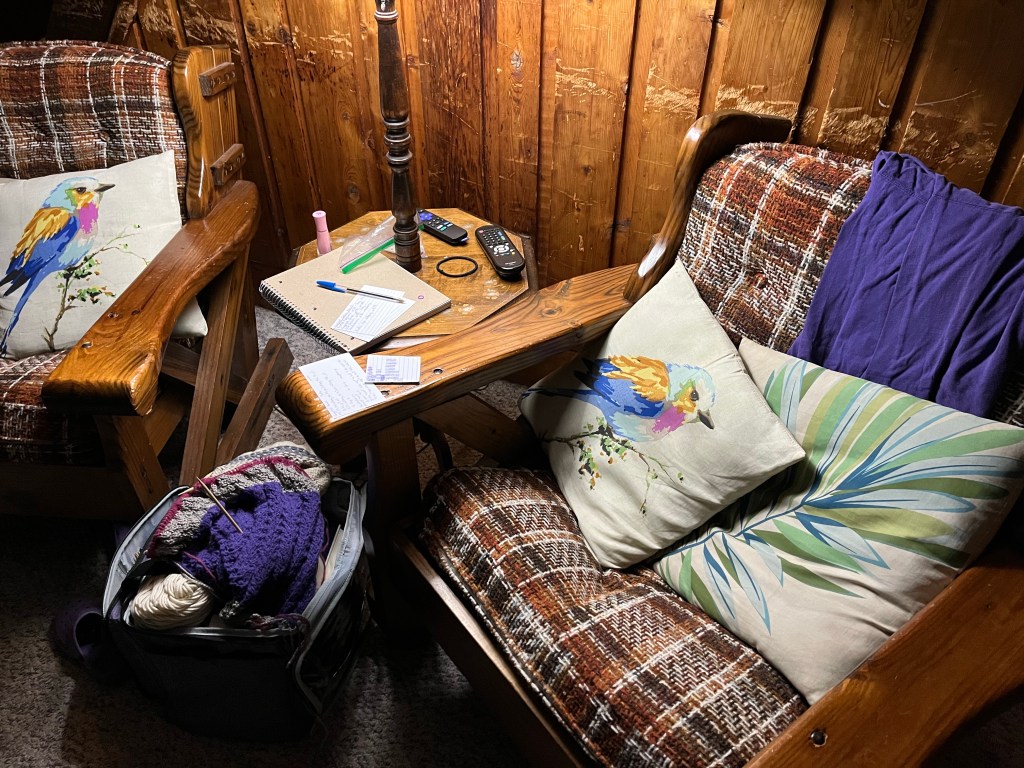 I wanted to make knitting as easy as possible for this trip and wrote my pattern out on index cards with one for tally’s. Thanks to the bag from my sister, I am able to keep everything well contained. Her dog loves burying his nose inside and sniffing around.