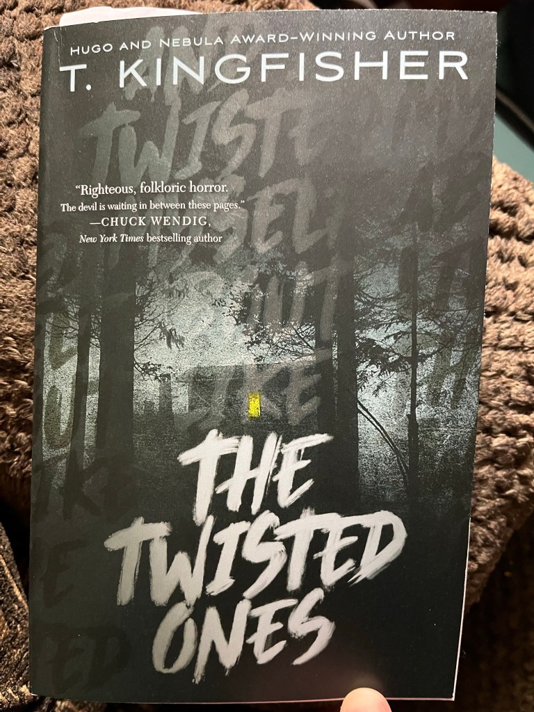This book, The Twisted Ones by T. Kingfisher, has got me jumping when my kids make a sound. I’m only a quarter of the way in, nothing has happened, and I’m creeped out by stones. I don’t want to put it down, but I want to go to sleep.
