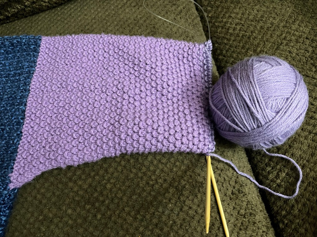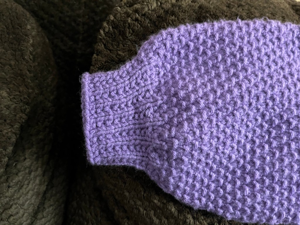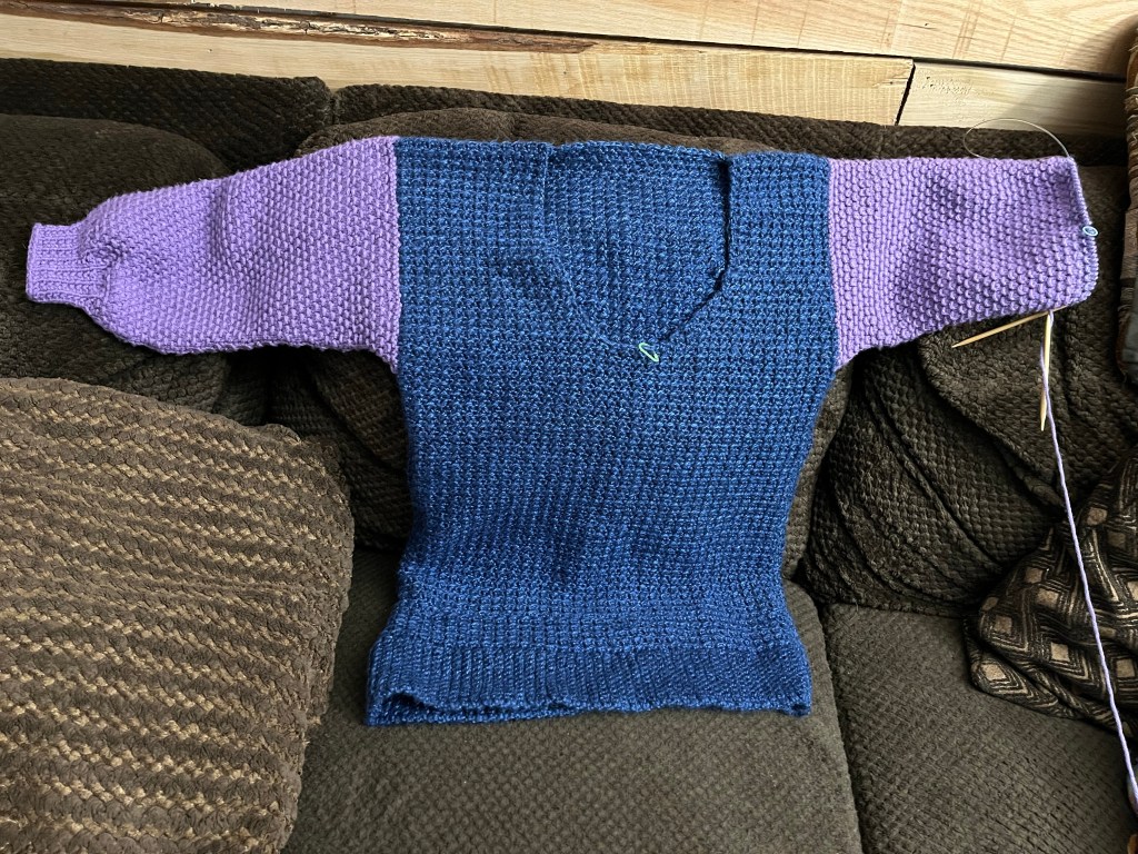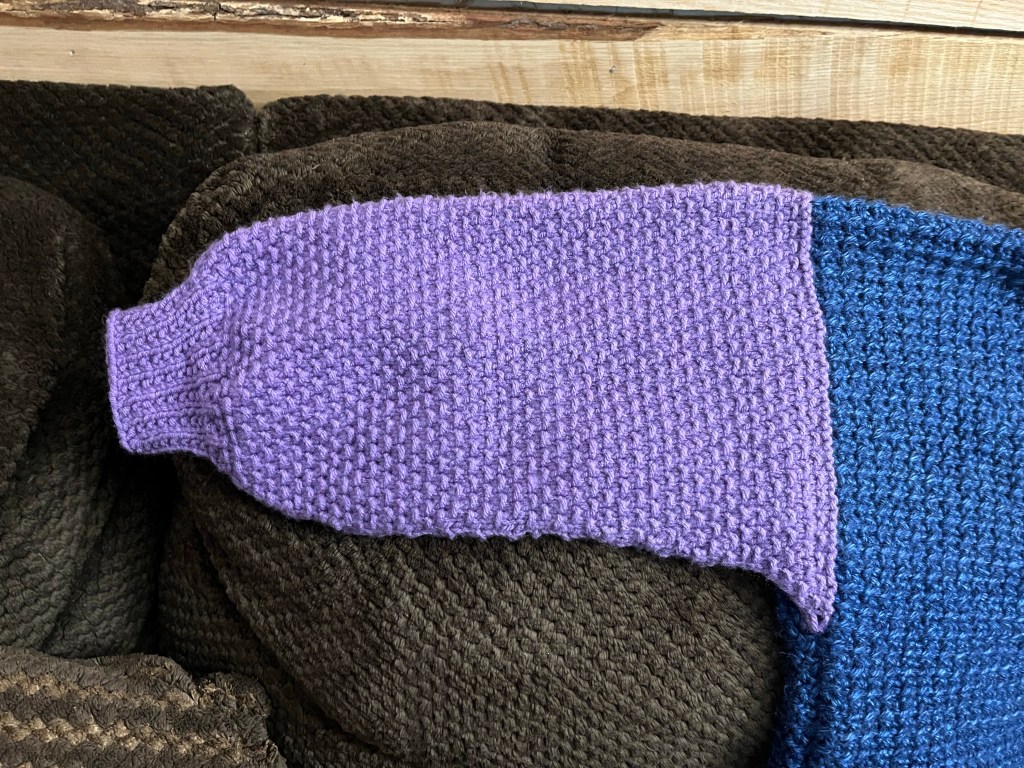 I can’t bring myself to rip this sleeve back and add the new shade of purple to make the sleeves match. Nor do I want to rip the second sleeve out to make it all the same purple. My daughter is a funky kind of person and seems to be happy with what’s happening. So onward I will knit.