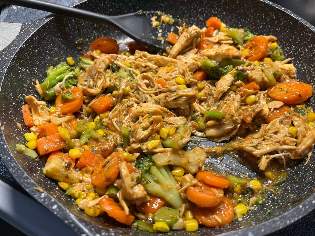 One night was chicken stir fry with brown rice, frozen vegetables, and teriyaki sauce. It made for some good lunch leftovers for work.