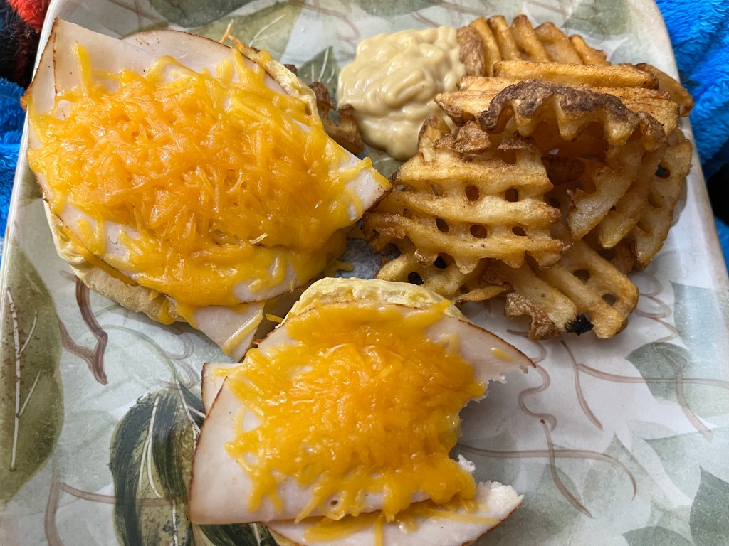 We had open faced turkey sandwiches on biscuits with honey mustard and cheddar cheese. Fries on the side with more honey mustard for dipping. Fairly simple meals that have left us feeling pretty satisfied.