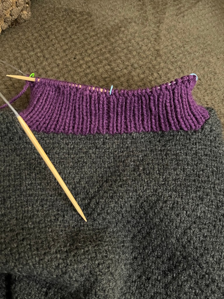 This particular sweater has been in the works for a while now. I enjoy it, but it gets dull after awhile. Especially this section of the collar. I love knit 1, purl 1 rib, but I get so bored! I actually started another project last night because everything is at a boring spot and I wanted some challenge.