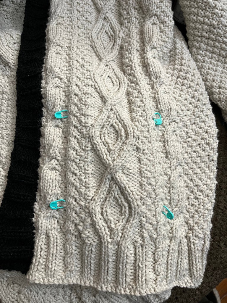 The collar is why it was in exile. I would have preferred making the edges come down a bit more, but the thought of trying to “fix” it almost makes me nauseous. I tried it on again and I think with a few stitches and good blocking it will work out just fine the way it is.
