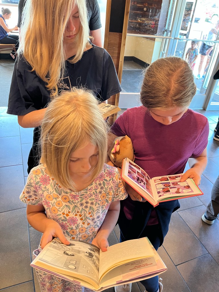 While waiting for us grownups to get our food (and then we all got drinks somewhere else), they eagerly read one of their choices. It always warms my heart to see them enjoying books.
