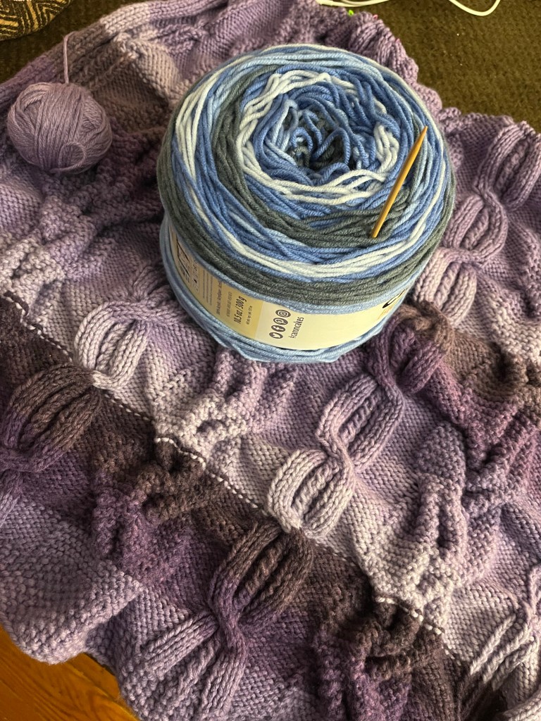 I also ran out of yarn, again. I thought it would be a standard color, but the seasons have changed and this color was no longer on the shelves. So I’m switching to this blue. We’ll see how it works out. So much for my purple scheme.