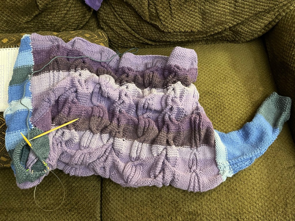 The armholes came out perfectly even and we’re really fun to knit up. Yes, I like knitting sleeves. One section of cabling kept it interesting.