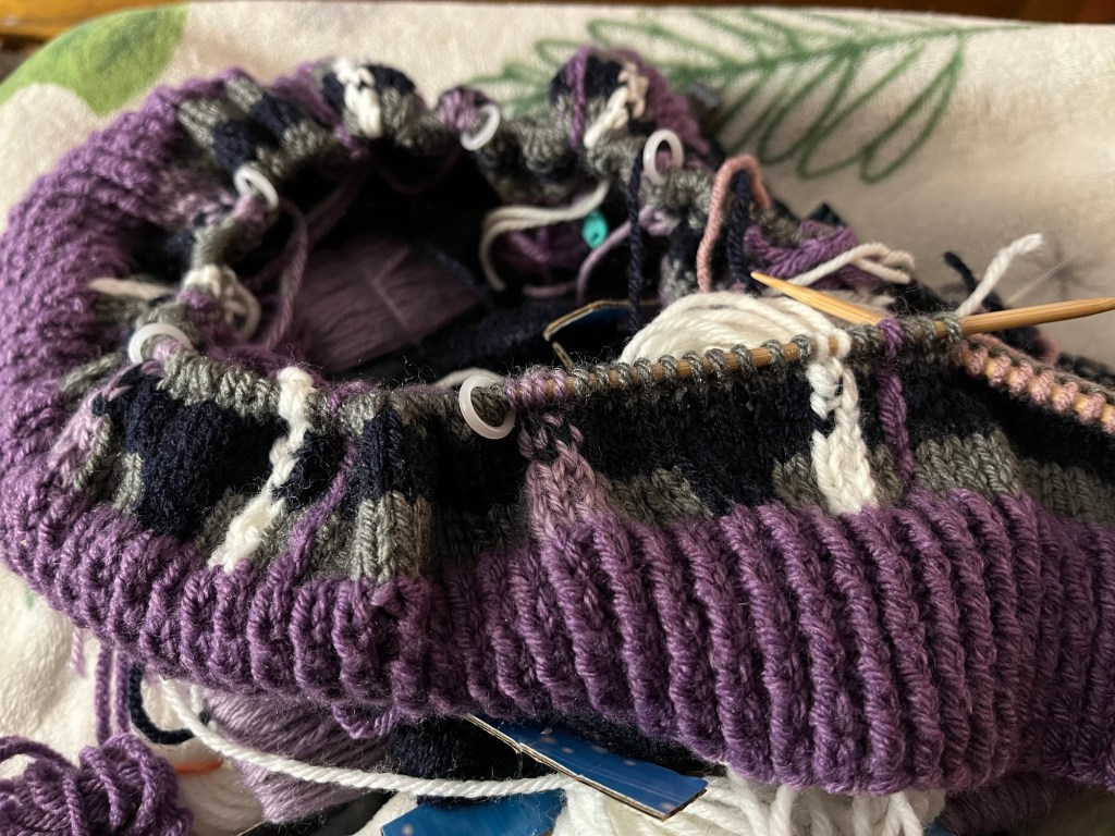 I’m wiggling and puffing stitches as I go. Sticking my needles into finished v’s and tugging to even them out. I’m trying to remember to keep my carry back floats loose. I don’t have a lot of experience with this amount of color work, but I’m definitely having fun.