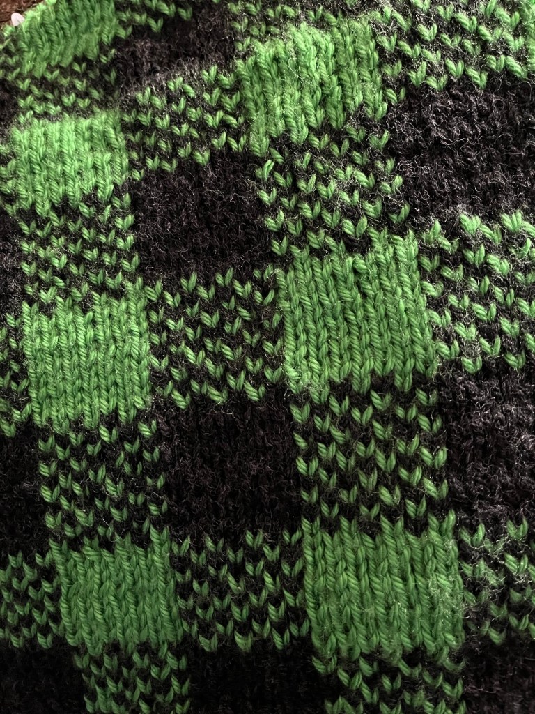 As much as I’m enjoying making progress on this large cowl, my eyes kept pulling to the green and charcoal Buffalo plaid double knit scarf, deliberately laid within easy reach for whenever my fingers craved its repetitive rhythm.