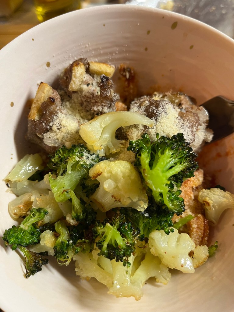 This one took me a while to decide on, but once I did it was easy to get the kids involved. Turkey apple meatballs with onions. Roasted broccoli and cauliflower. Underneath all that, and the Parmesan cheese, is three kinds of pasta with red sauce. Just what was hanging around. It was delicious and a big hit!