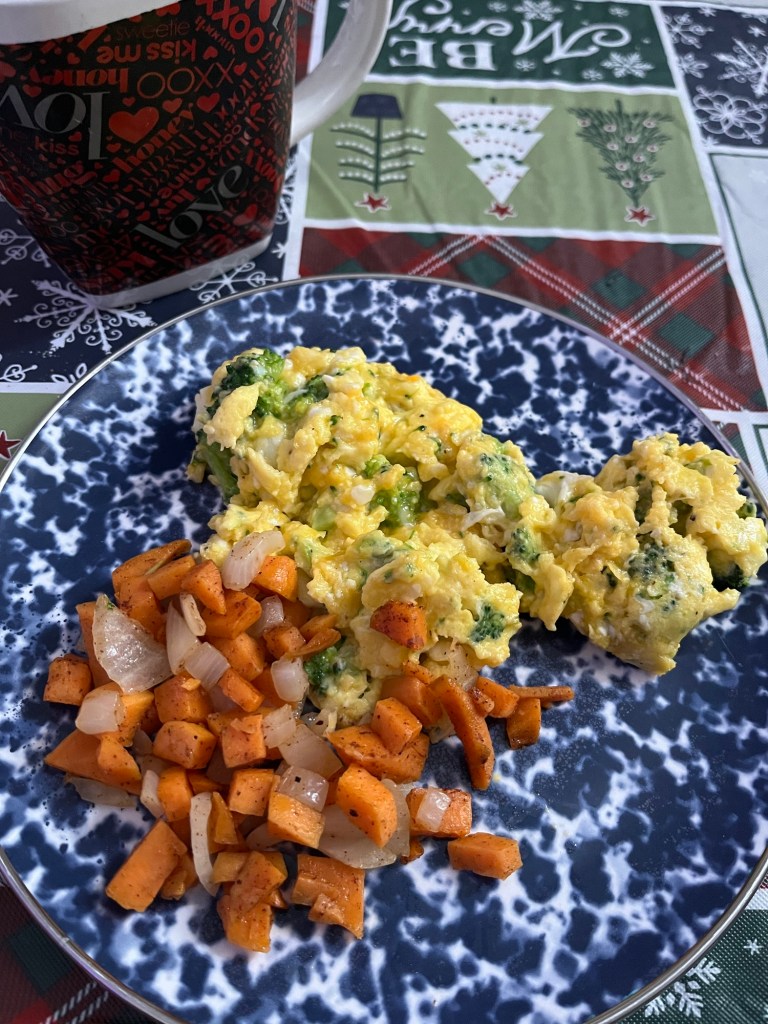 The kids always love cheddar broccoli eggs. The poor sweet potatoes, though. They were good, but the onions kind of wrecked it. This time the middle one helped out and we got it done in time for her to eat and get back to class for FID (school on a snow day).