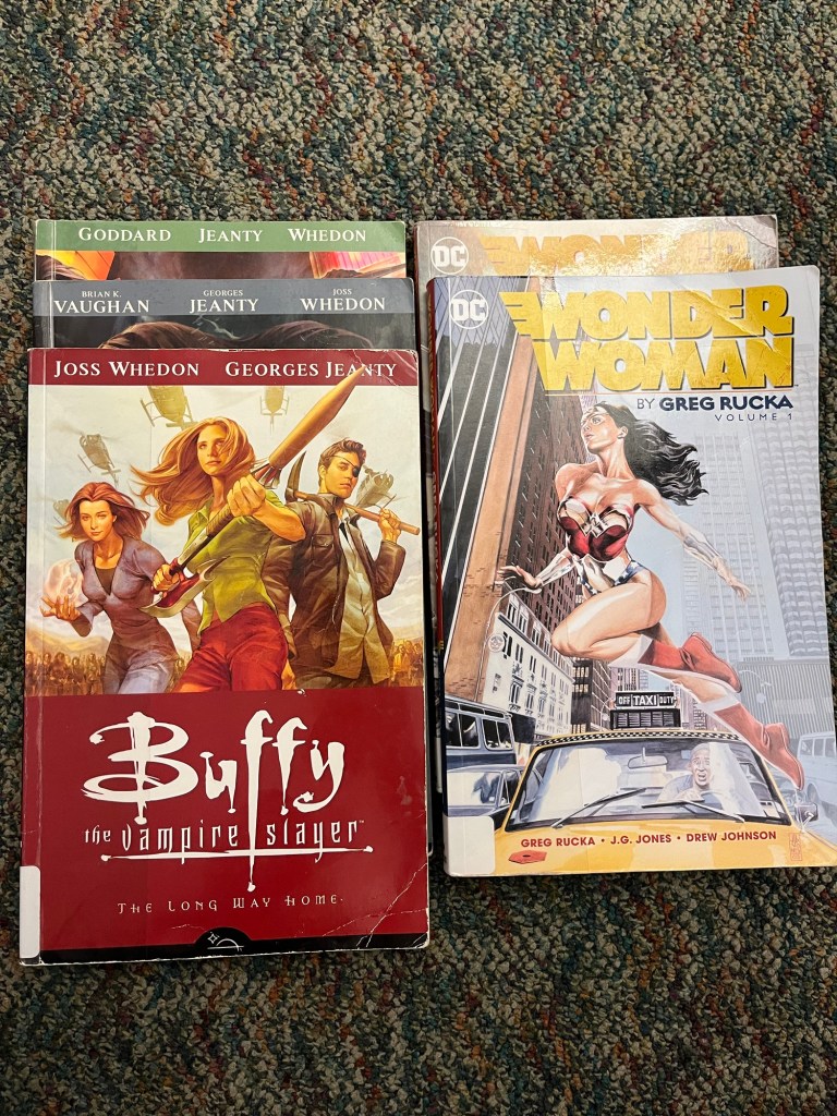 Even though I have plenty at home to read, I thought it’d be fun to try the Buffy comics. Whatever this version is looked the best of the three story lines on the shelf. I’m also always looking for more Wonder Woman. I don’t like every author or artist’s variation of her, so I’m hopeful I’ll like these.