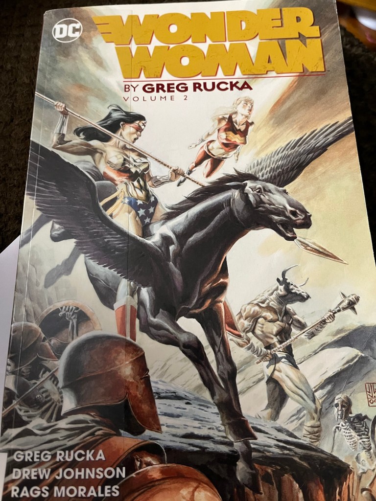 At least Greg Rucka doesn’t disappoint. I have several of another Wonder Woman series he did and it’s one of my favorites. He gets it. The art is amazing too. Between the story and the drawings, I lost myself in these two volumes for a couple days. I love the Minotaur.