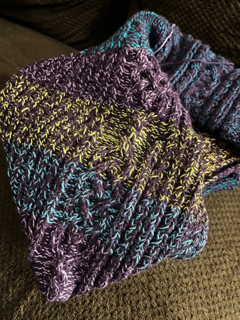 It’s always a journey. The nifty thing I did with this hood doesn’t actually work, so I’m fixing it, by adding to the front. I’m just not sure moss stitch is the right choice here.