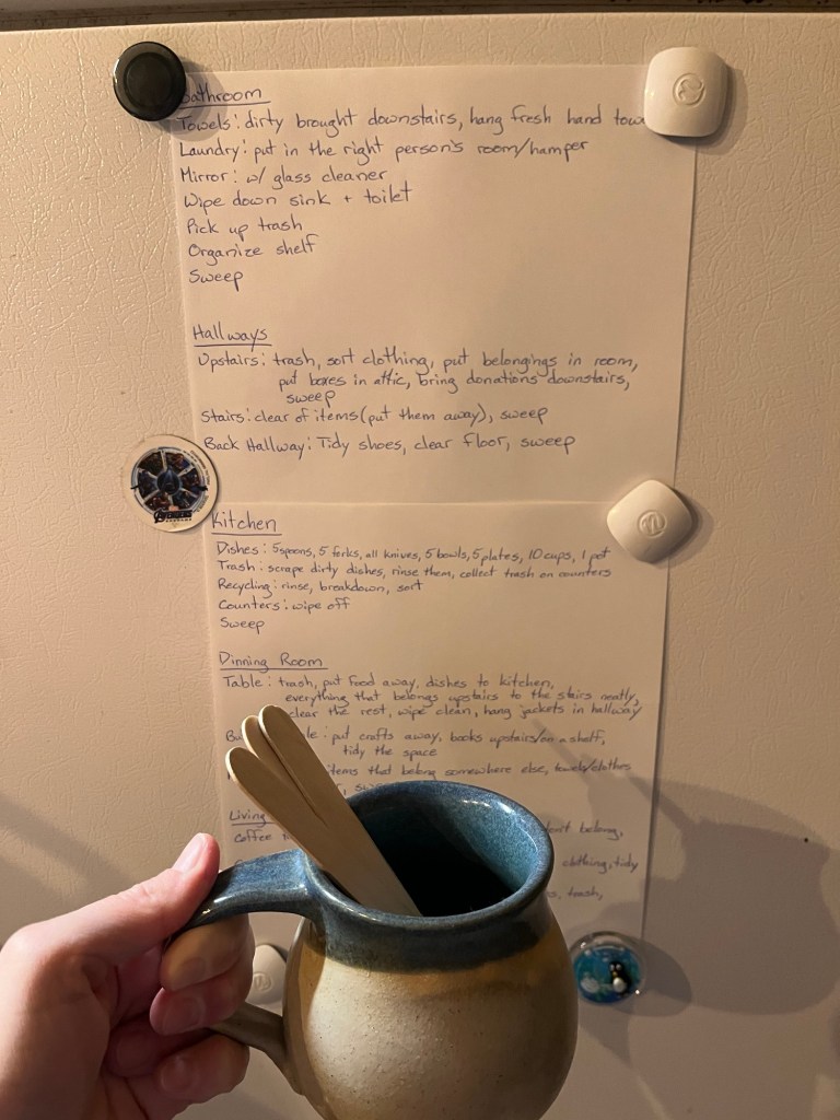 Each stick has a room on it. On the fridge is a list of all the tasks that must be completed for the chore to be done. The first couple days getting back into a chore routine can feel overwhelming, but after that there’s so much less to clean each time.
