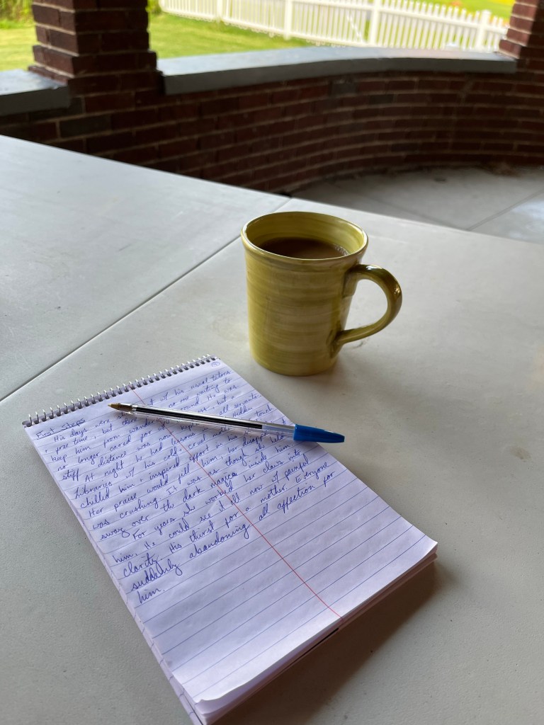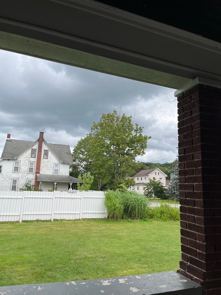 I’ve taken to sitting on my porch when writing. I live in a very quiet neighborhood and what noise I do hear is soothing. Comforting. The weather was perfect for it the other day. Mildly threatening clouds with a cold, clean breeze. Today the air is thick of irritants.