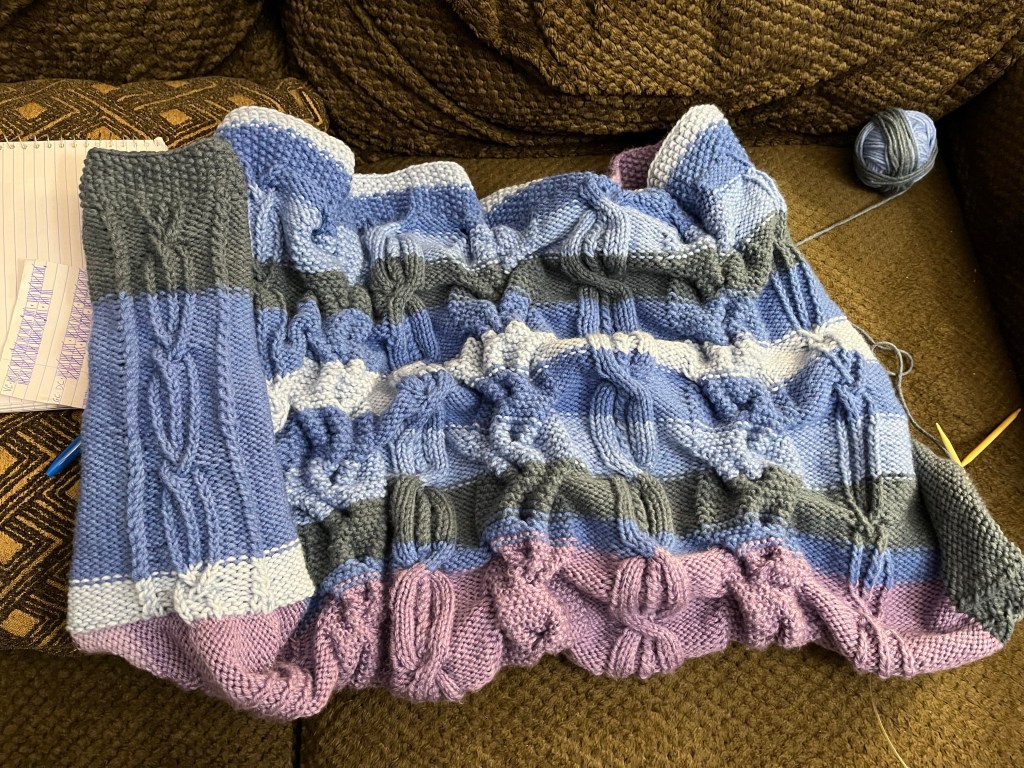I also ran out of yarn, again. I thought it would be a standard color, but the seasons have changed and this color was no longer on the shelves. So I’m switching to this blue. We’ll see how it works out. So much for my purple scheme.