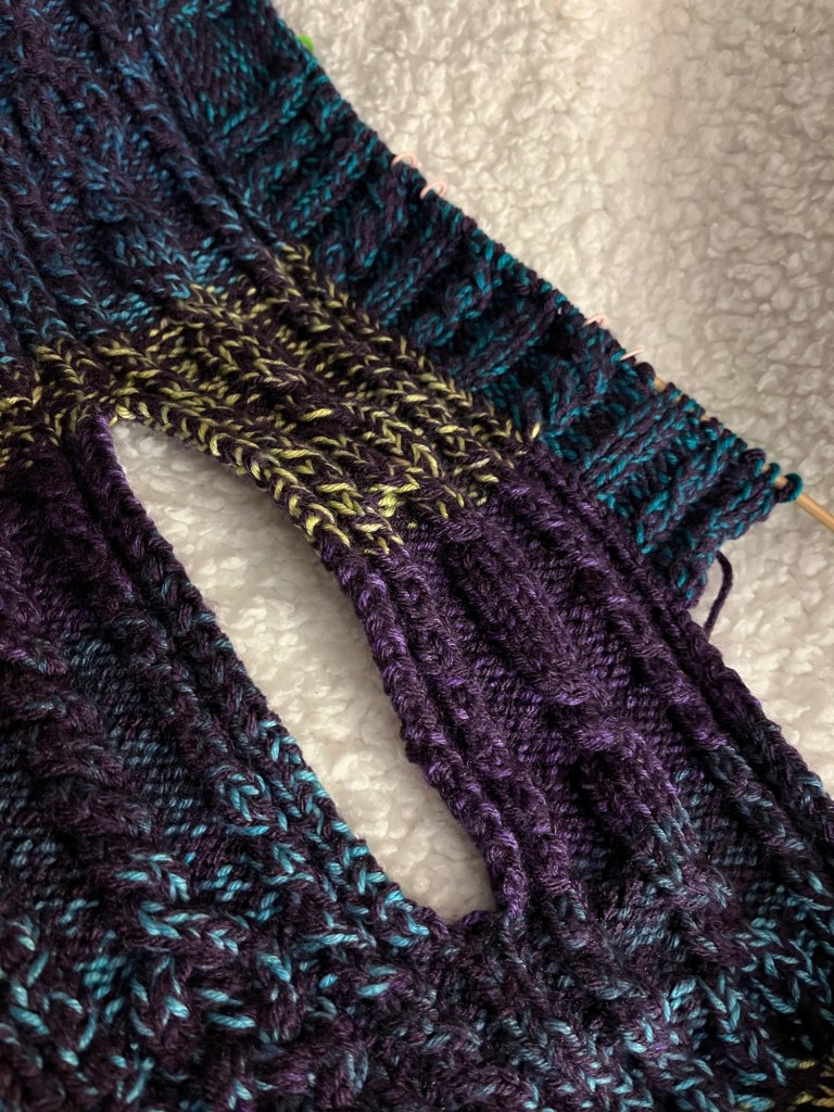 It’s always a journey. The nifty thing I did with this hood doesn’t actually work, so I’m fixing it, by adding to the front. I’m just not sure moss stitch is the right choice here.